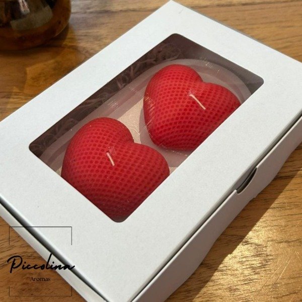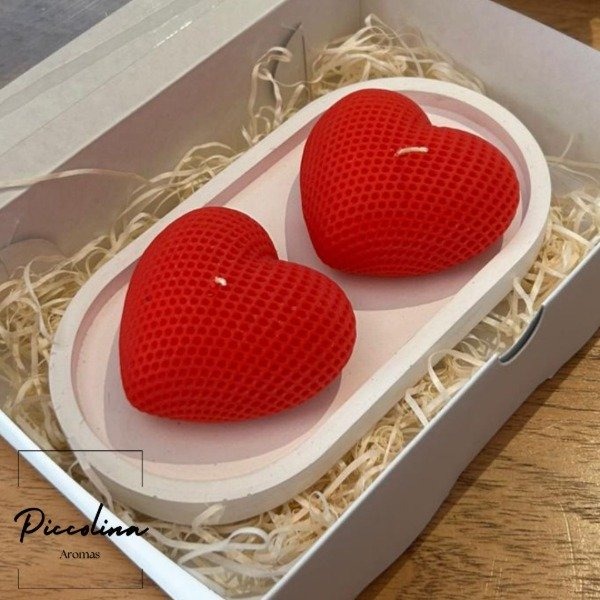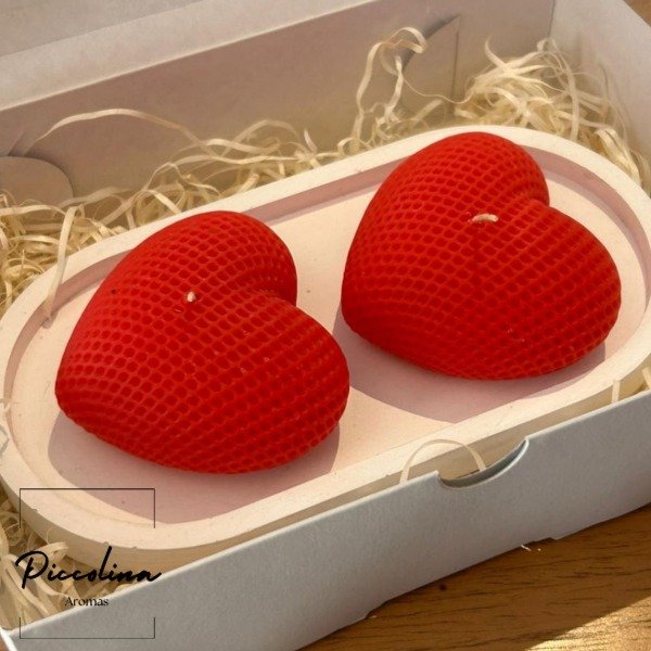 Incluye dos velas en forma de corazón tamaño grande con bandeja de yeso, presentadas en una cajita de regalo, listas para sorprender.