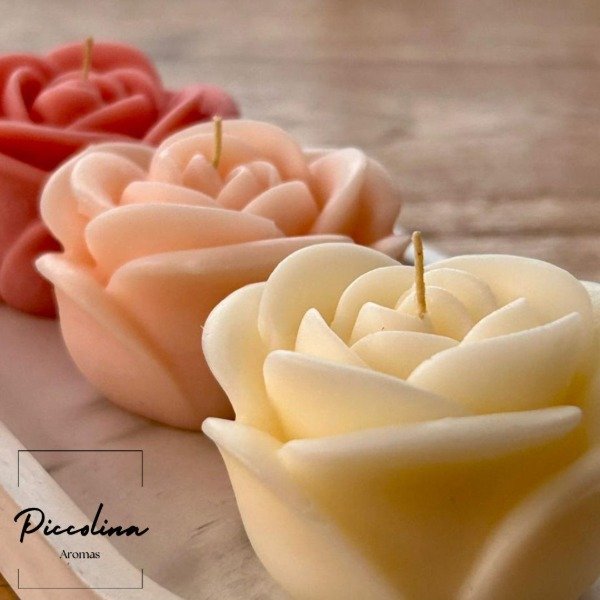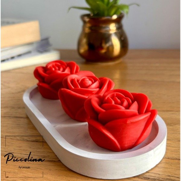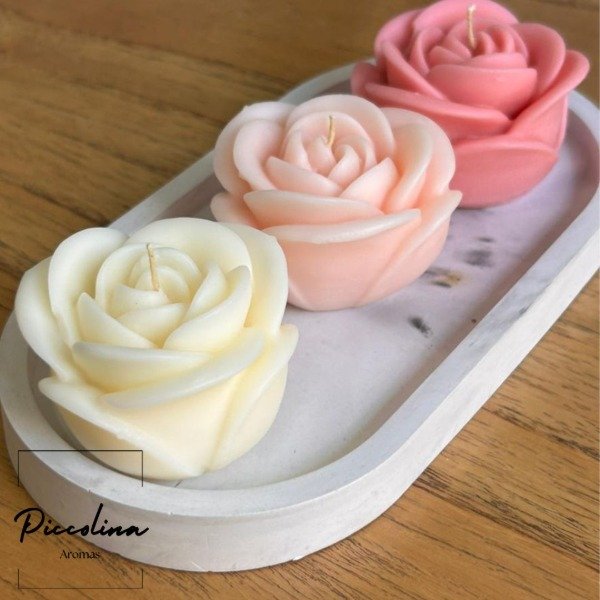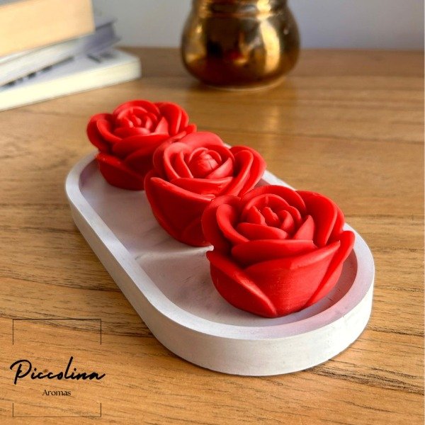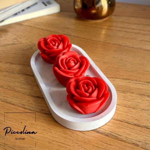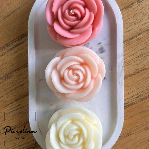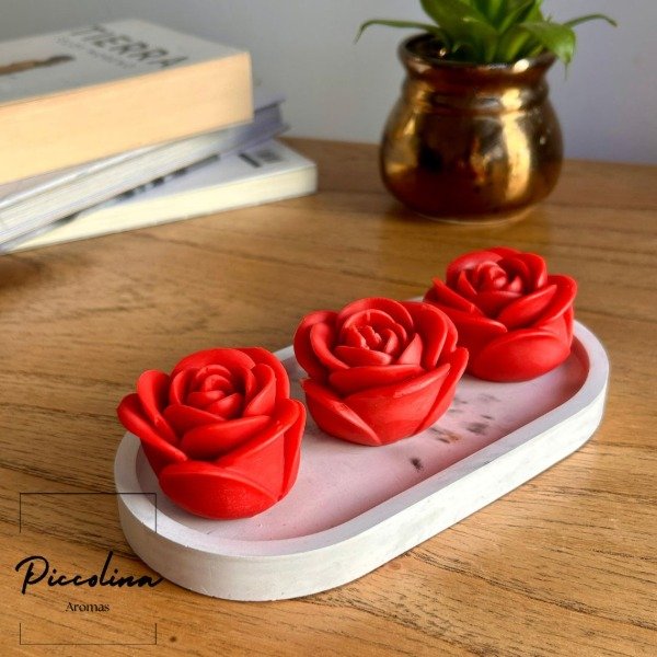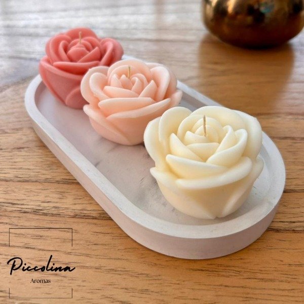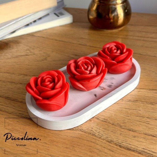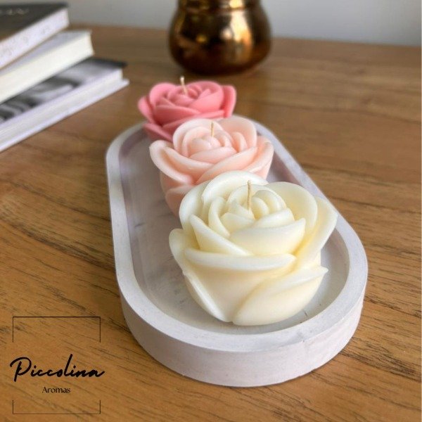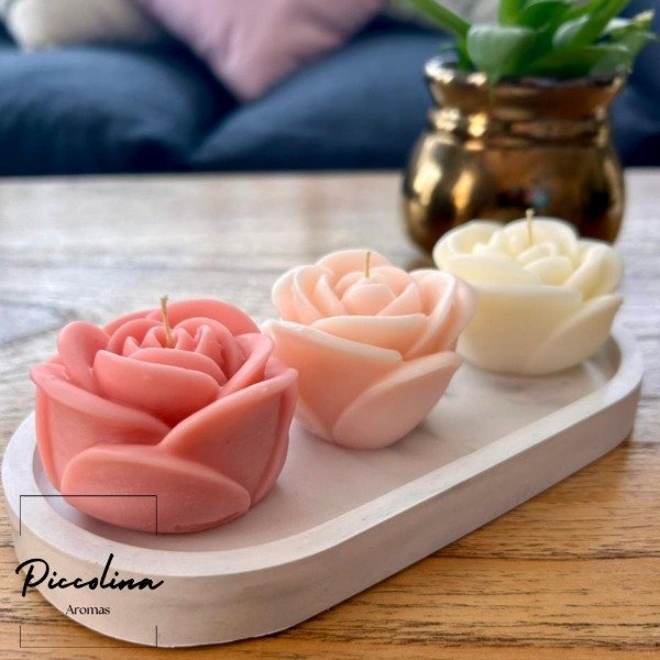 Este set incluye tres velitas con forma de rosa, acompañadas por una bandeja de yeso que completa un conjunto armónico y decorativo.